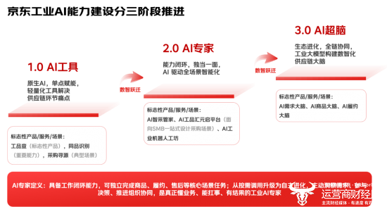 基于技术创新和场景实践的历练,京东工业明确了对工业AI大模型能力建设的规划:从1.0阶段的AI工具,跃迁到2.0阶段的AI专家和3.0阶段的AI超脑。