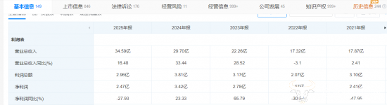 相对应的,公司在2021年至2025年的营收分别为17.87亿元、17.32亿元、22.26亿元、29.70亿元及34.59亿元,分别同比变动2.41%、-3.10%、28.52%、33.44%及16.48%,呈现波动上升的趋势。
