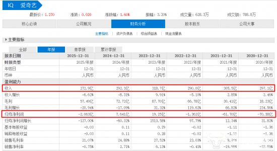 与此同时,2025年归母净亏损为2.063亿元,与上年盈利7.641亿元形成鲜明对比。要知道,爱奇艺此前才连续盈利两年。据东方财富网统计,从2020年至2024年,该公司的归母净利润分别为-70.38亿元、-61.70亿元、-1.36亿元、19.25亿元、7.64亿元。短短两年,还没有把以前亏的赚回来,现在又亏了。