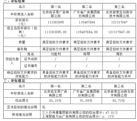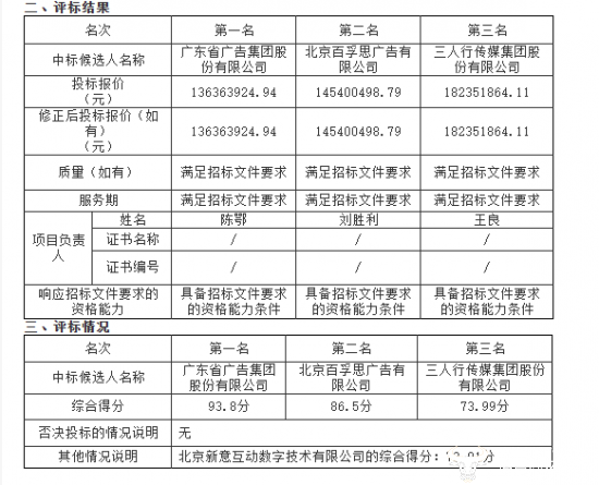 其中,广东省广告集团股份有限公司凭借超1.36亿元投标报价拔得头筹,综合得分93.8分;
