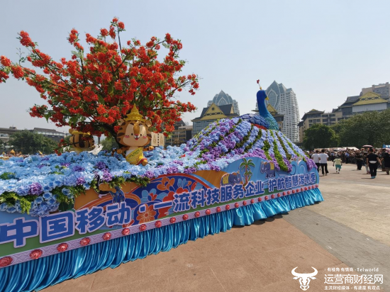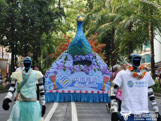 要说泼水节最具视觉冲击力的环节,非民族民间文化大游演莫属。傣族、布朗族、哈尼族等各民族方队盛装起舞,尽显版纳多民族风情。一辆辆花车紧随其后缓缓穿行,沿街播撒祝福。其中,中国移动云南公司(以下简称:云南移动)孔雀花车格外亮眼,蓝孔雀傲立车头,凤凰花树热烈盛放, IP形象“豹豹”惬意窝在花荫下,车前三台机器人随鼓点起舞,吸引了不少人打卡拍照。