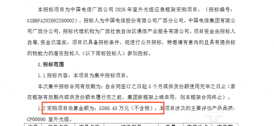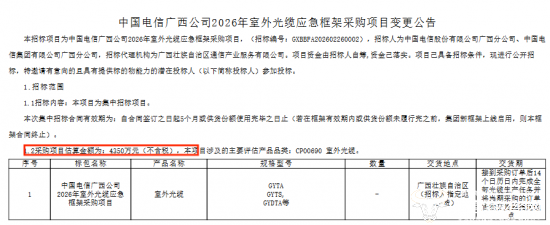 日前,广西电信“2026年室外光缆应急框架采购项目”经过两次变更终于揭晓了中标候选人名单。