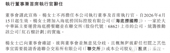 据海底捞海外业务特海国际发布的公告,杨利娟已辞任公司执行董事兼首席执行官职务,由原首席运营官、执行董事李瑜接任。此外,公告中还提到,杨利娟将加入海底捞国际控股有限公司,统筹推动公司“红石榴计划”的实施。