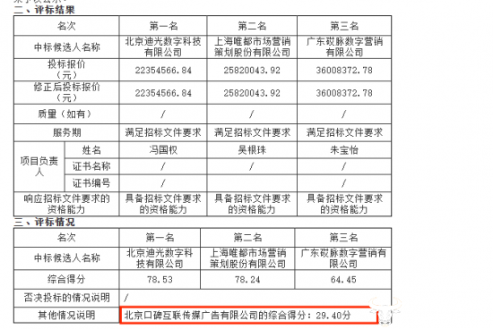 而两份名单中不同的是,在4月13日发布的名单中,“北京口碑互联传媒广告有限公司”得分29.4遗憾出局;而在4月14日发布的名单中,是“广东省广告集团股份有限公司”得分29.4遗憾出局。由此来看,可能是前一天发布的公告存在错误,第二天进行了更正?