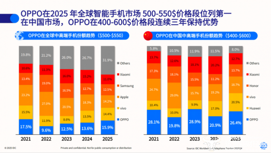 随着Ultra系列出海进程的持续加深,OPPO在全球市场的高端机型占比持续提升。根据权威市场调研机构IDC的数据显示,2025年,OPPO在全球500美元~550美元价位段稳居第一,并以 284 美元的平均售价位列全球第三,高端化成果日益显著。更重要的是,OPPO在海外市场正在完成品牌认知层面的质变,即从「性价比选择」向「高端可靠品牌」的认知跃迁,越来越多全球消费者将OPPO视为高端智能手机的可靠选项,而非性价比替代方案。