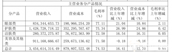 据悉,丸美生物旗下共有护肤品牌“丸美”及彩妆品牌“恋火”两大系列,其中丸美品牌实现营业收入25.47亿元,同比上升23.94%,PL恋火品牌实现营业收入9.06亿元,同比基本持平。而公司护肤类产品实现收入14.29亿元,同比增长26.99%,眼部类产品收入同比上涨21.04%至8.34亿元,毛利率也提升2.11个百分点至8.34亿元。