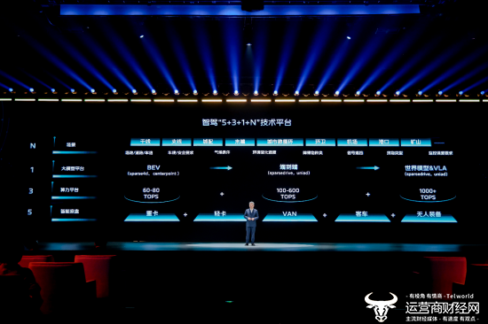 福田汽车打造了 "5+3+1+N" 智驾技术平台:"5" 涵盖重卡、轻卡、VAN、客车和无人装备 5 类智能线控底盘;"3" 提供 60-80TOPS、100-600TOPS、1000+TOPS 三个不同算力平台;"1" 是统一的智能化大模型平台,以端到端为基础,后续逐步拓展到VLA和世界模型;"N" 则代表干线、支线、城配、末端、城市微循环以及机场、矿山、园区等全场景智驾应用落地。