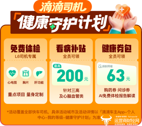 滴滴始终关注司机师傅的健康,于4月升级了“滴滴司机健康守护计划”,为全国快车司机提供针对三高及心脑血管问题的季度健康补贴。同时,滴滴联合互联网健康平台,首批与蚂蚁阿福合作,为司机提供在线问诊和线上购药优惠。部分城市的L6 高等级司机还可享价值300元的年度免费定制体检。