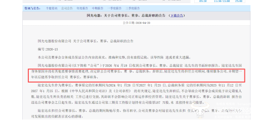 值得注意的是,根据国光电器公告,公司于2026年4月19日收到公司董事长、董事、总裁陆宏达的书面辞职报告。陆宏达因身体原因并尚有其他重要事情需要处理,决定辞去公司董事长、董事、总裁职务。