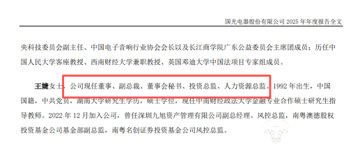 2022年12月,王婕加入国光电器,也就是说,她加入公司不到四年就被推选为董事长。