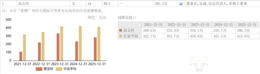 据公司公告,高玉玲2025年薪酬为286.48万元,较2024年的235.66万元增加50.82万元,涨幅21.6%,三年间波动明显,成为去年少数薪酬上涨的高管之一。