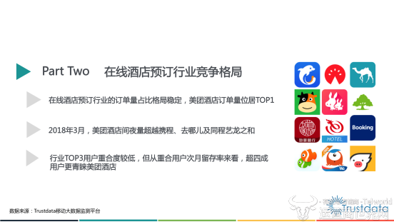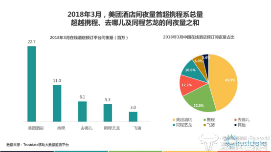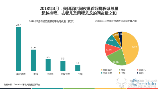 日前,第三方移动互联网大数据监测平台Trustdata发布了《2018年Q1中国在线酒店预订行业发展分析报告》。报告显示,在移动端用户规模快速增长及用户年轻化等因素共同作用下,今年第一季度的在线酒店预订行业迎来新的变化:2018年3月,美团酒店以2270万的单月间夜量首次超过携程、去哪儿、同程艺龙的总和。同时,2018年第一季度,美团酒店以5770万的订单总量,位居行业第一名。