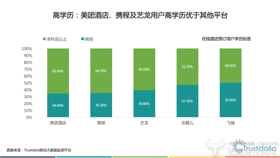 值得注意的是,在线酒店预订用户呈现出年轻化特征。从年龄分组情况来看,21-30岁的在线酒店预订用户占据了42.7%,占比在各年龄分组中位居第一;其次为31-40岁用户,占比为29.8%。整个21-40岁的用户占据了整体用户的72.5%。美团酒店的80及90后用户占比高达81.8%,用户更年轻且购买力更强。追求品质、希望在旅行中获得丰富体验、女性逐渐成为决策主导等,是这一群体十分鲜明的消费特点。
