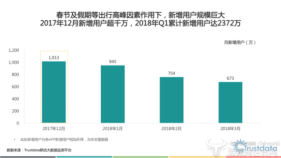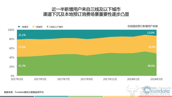 报告显示,2018年第一季度月均MAU超过7500万,其中三线及以下城市的用户占比提升至46.5%,旅游领域的消费升级正逐步从一二线城市向低线城市推进。同时,从去年年底开始,新增用户规模巨大。其中,2017年12月单月新增用户超千万,2018年第一季度累计新增用户达2372万。近一半新增用户来自三线及以下城市,渠道下沉及本地预订消费场景重要性凸显。