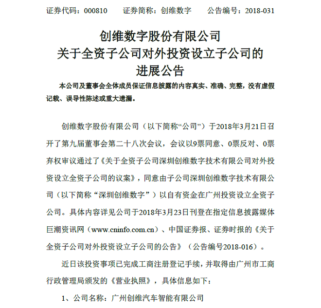 值得注意的是,当时的公告虽然披露了新公司的名称,但同时指出公司名称暂定,“具体以广州工商部门的最终核准名称为准”。如今,进展公告中再次确定了子公司的名称,为广州创维汽车智能有限公司。
