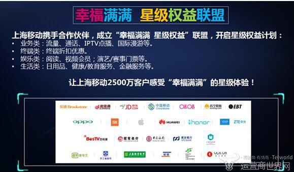 据了解,上海移动除了推出“提速降费”新举措,回应政府和市民需求,同时,通过携手苹果、华为、荣耀、vivo等终端厂商,苏宁、光大、迪信通、乐语等连锁商,以及中国银行、浦发银行、招商银行、京东、爱奇艺、咪咕、高校后勤、百视通等合作伙伴,成立“幸福满满,星级权益”联盟,开启星级权益计划。