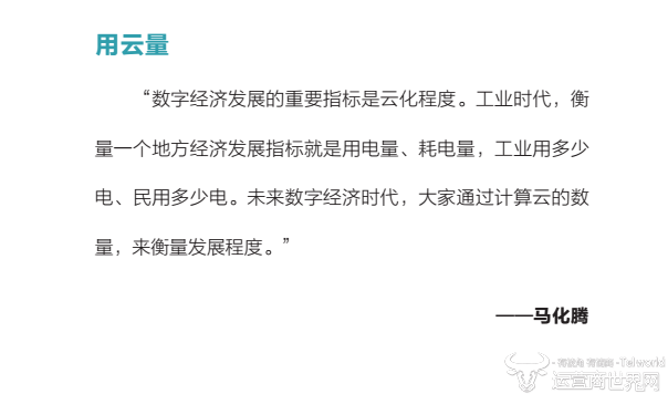同时他还以工业时代的发展指标举例:“工业时代,衡量一个地方经济发展的指标就是用电量、耗电量,工业用多少电、民用多少电。未来数字经济时代,大家通过计算云的数量来衡量发展速度。”