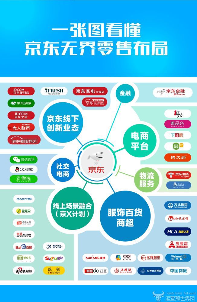 京东通过与腾讯合作,开始了社交电商之路,例如微信购物,QQ购物,微选。打通社交平台中的社交流量与购物场景之间的渠道,与唯品会、1号店等电商平台展开合作,将资源充分整合。此外,京东还从品牌、产品、流量、技术和运营等方面为品牌商全面赋能:携手海澜之家、红豆等服饰品牌共建“美美与共”时尚圈;与沃尔玛、中粮一起“向供应链要效益”。在这个过程中,消费者也将享受到更加多元和个性化的服务。