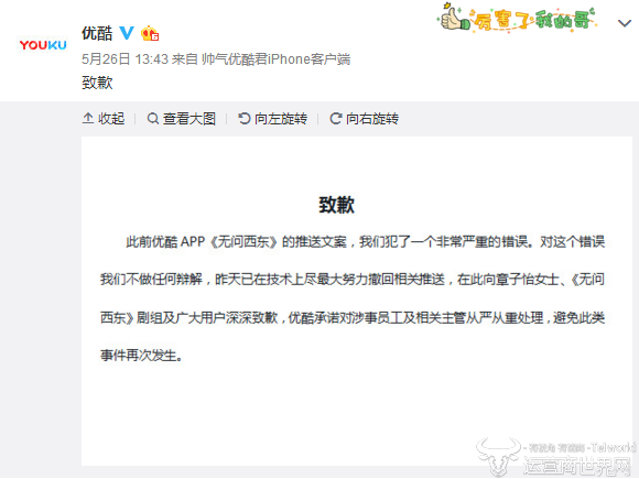 随后,优酷对外公布了致歉声明,表示自己在推送文案的措辞方面犯了不可辩解的错误,技术已经在进最大努力撤回相关推送内容,对于受到伤害的章子怡和用户表示深深的歉意。