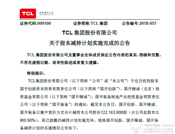 其实,此次股份减持计划早在今年1月份TCL集团发布的《关于公司持股5%以上股东减持股份计划的预披露公告》中就已经开始。2018年2月26日,国开创新、国开精诚、国开装备累计减持TCL集团约4000万股份,占TCL集团当时已发行总股本的0.31%。