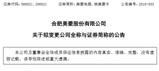 日前,合肥美菱股份有限公司关于拟变更公司全称与证券简称的公告,拟将“美菱电器”更名为“长虹美菱”。