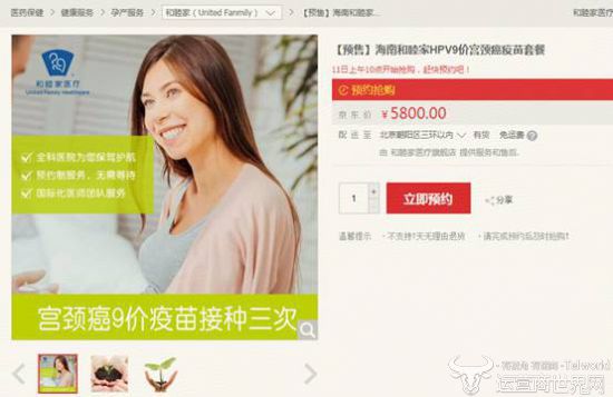 九价宫颈癌疫苗开放预约的消息迅速在女性消费者圈中传开,不少人前往京东平台进行预约。从京东商城和睦家销售页面来看,该九价宫颈癌疫苗套餐目前的预约价为5800元。