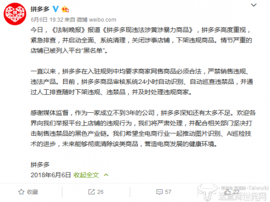 对此,拼多多在微博上回应称,在发现问题后,立刻展开了紧急排查,并启动全面、系统清理,关闭涉事店铺,下架违规商品。情节严重的店铺已被列入平台“黑名单”。