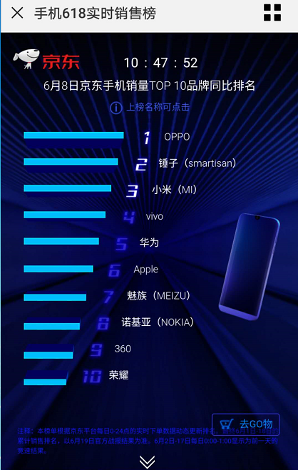 除此之外,截至6月8日上午10点47分,京东手机销量前十品牌同比排名中,OPPO增速显现霸榜第一,摆脱了一周之前的萎靡,还是奋起,与锤子和小米分别位列前三;而在京东手机销售额前十品牌同比排名中,小米超OPPO和锤子位居第一。