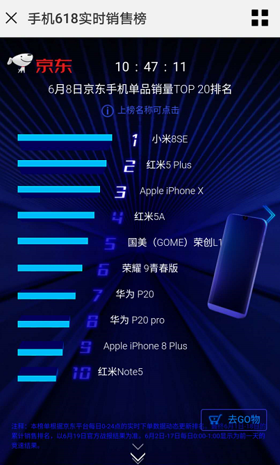 截至6月8日上午10点46分,手机厂商之前的竞争十分激烈了,京东618实时销售榜显示,在手机销量品牌前五名排名中,小米位居榜首,其次是华为、Apple、荣耀以及国美,值得一提的是,小米甩了荣耀一大截,国美趁势上位。