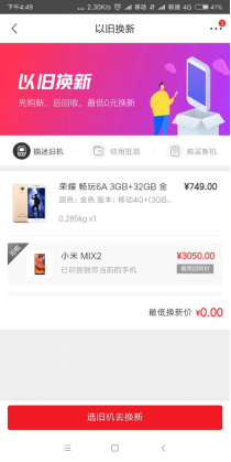 新版以旧换新满足用户快速变现的需求,在京东平台购买新机时,通过信用回收将旧机变现,得到与预付金额相应的京东E卡,之后只需支付差价即可完成购买新机,同时下单结束新机配送完成后,京东将为用户预留充足的资料备份及转移时间,之后再由专人上门取走旧机。