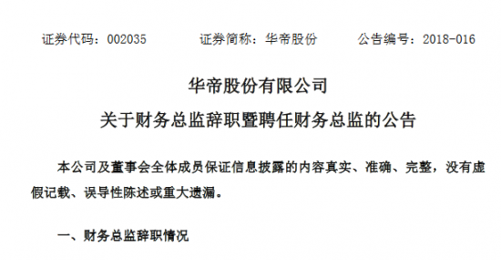 公告显示,华帝股份有限公司董事会于近日收到公司财务总监石晓梅提交的书面辞职报告,石晓梅因个人原因辞去公司财务总监职务。根据相关规定,石晓梅的辞职自其提交书面辞职报告至公司董事会时生效,辞去财务总监职务后,其仍在公司任职。