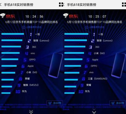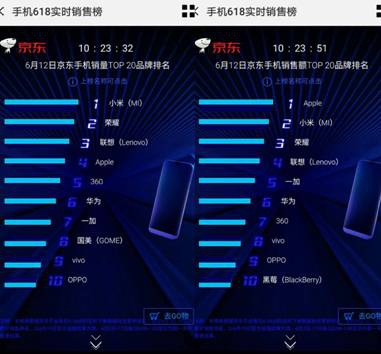 截至6月12日10时23分,联想已经突破重围,跃居京东手机单日销量排行榜第三名,赶超苹果和华为。同时,在京东手机单日销售额排行榜中紧随苹果、小米和荣耀,排名第四。