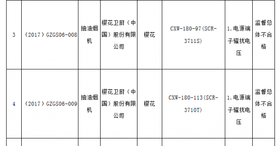名单显示,樱花卫厨(中国)股份有限公司生产的型号为“CXW-180-97(SCR-3711S)”和“CXW-180-113(SCR-3710T)”的两款抽油烟机“电源端子骚扰电压”项目被查不合格。