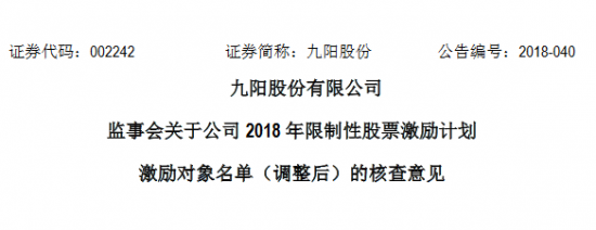 日前,九阳股份有限公司监事会发布了关于公司2018年限制性股票激励计划激励对象名单的核查意见。除3名离职员工以外,其他员工均被授予股票。