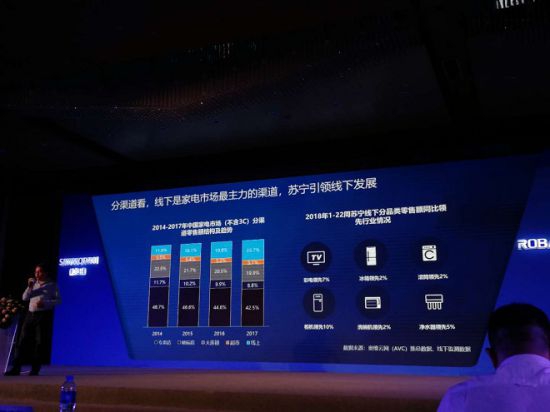 数据显示,2014年至2017年,在中国家电市场中,线上渠道从当初的11.6%提升到2017年的23.7%,线下渠道从当初的48.7%下降到42.5%,但从数据来看,线下渠道仍旧占主导地位。其中,苏宁易购在线下的表现均领先于行业。