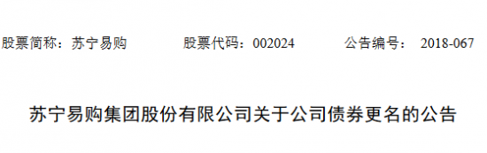 日前,苏宁易购集团股份有限公司发布了关于公司债券更名的公告。早在2018年初苏宁中文证券简称就由“苏宁云商”变更为“苏宁易购”,根据命名规则和公司更名事宜,此次苏宁将本期债券也改了名字。