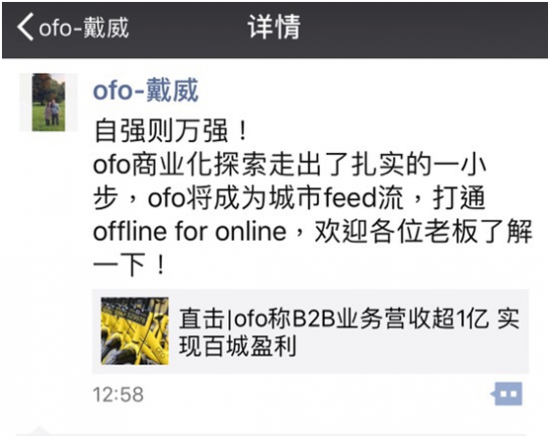 6月13日,ofo对外透露称B2B业务目前营收已突破1亿元,各项业务进展顺利,百城实现盈利。随后,ofo创始人兼CEO戴威转发这则新闻,并提出“ofo将成为城市feed流”。记者了解到“城市feed流”这一概念的提出,在共享单车行业内尚属首次。据ofo内部人士表示,“城市feed流”主要是指ofo车身广告的独特业务模式。