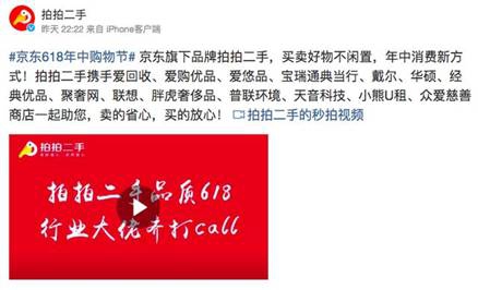 6月12日22时22分,京东旗下品质二手交易平台拍拍二手发布了一条视频引发轰动,视频中有14家行业大佬纷纷自发出来为拍拍二手的618大促站台,用自己的方式为其618助力加油,拍拍二手究竟有何“通天”的本事,竟引来诸多大佬助阵?