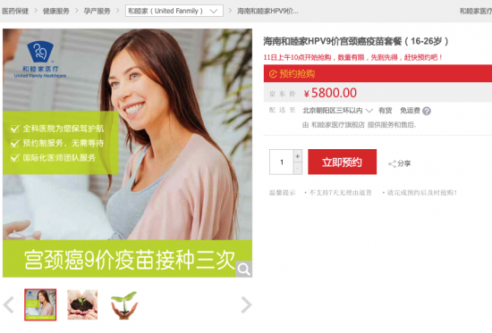 迄今为止功能最强大的宫颈癌疫苗——HPV9价疫苗刚刚获得审批在内地上市,这对广大女性群体而言绝对是一个好消息,但没想到,更大的惊喜还在后头,京东在618期间联手和睦家竟于线上开放了疫苗预售,一剂难求的HPV9价疫苗也被搬上了618舞台,一时间热议不断,引发了一轮激烈的抢购潮。