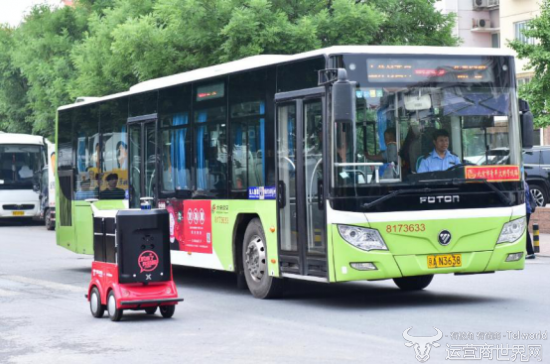 配送机器人和公交车正在一起等红绿灯,这个停车动作看起来相当标准。