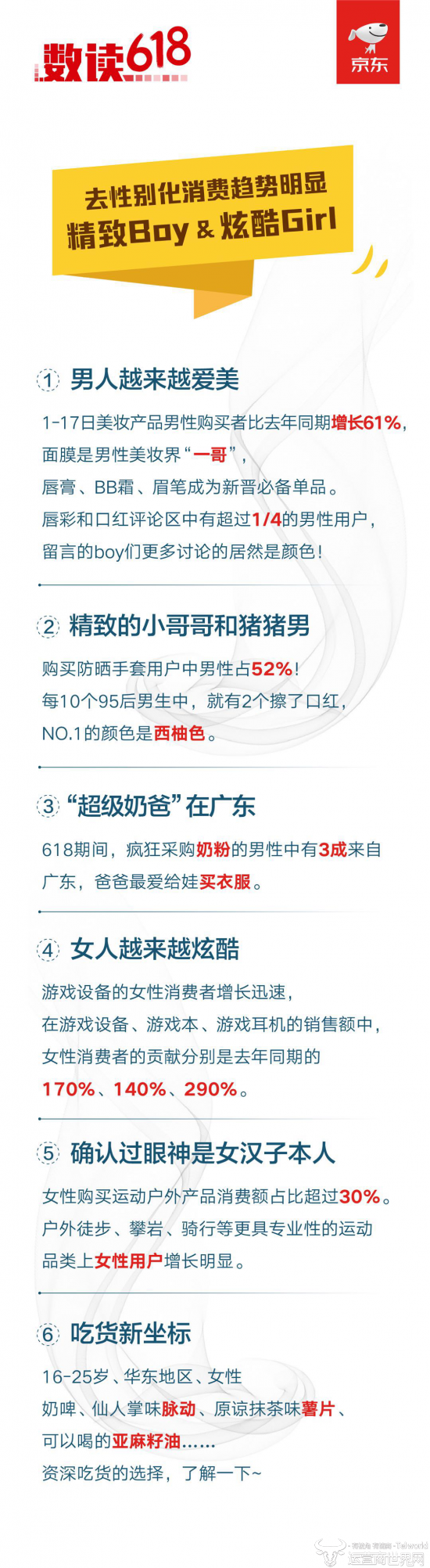 就拿京东今天刚出炉的618趣味数据来看,男人也越来越爱美。1-17日数据显示,美妆产品男性购买者比去年同期增长61%,面膜是男性美妆界的“一哥”,唇膏、BB霜、眉笔成为新晋必备单品。唇彩和口红评论中有超过1/4的男性用户,留言的男生们讨论更多的居然是颜色。不仅如此,精致也逐渐成为男性们的代名词,购买防嗮手套用户中男性占52%。每10个95后男生中,就有2个擦了口红,排名第一的颜色是西柚色,可见“小哥哥”们对于美的追求正在日益增长。当然也不能不提我们最爱买买买的女性大军,除了服饰、美妆等品类,她们在凸显男友力的运动户外品类上也在逐步扩大影响力!目前京东618数据显示,女性购买运动户外产品消费额占比已超过30%,户外、徒步、攀岩、骑行等更具专业性的运动品类上,女性用户增长明显。毫不夸张的说,网上购物正在用更多的优势满足人们对于时尚的追求,京东618年中购物狂欢节已成为成为消费者“大血拼”的重要时间结点。如果你还没在电商平台没在京东上买过东西,还不知道京东每年年中全民疯抢的这个大促,那你就真的OUT了!运营商世界网(官方微信公众号tel_world)——TMT行业知名新锐媒体,一家专注通信、互联网、家电、手机、数码的原创资讯网站。