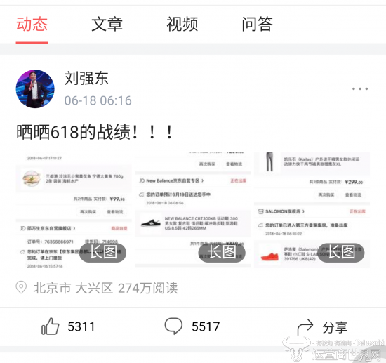 6月18日,持续了近二十天的“618“购物节到了最为火爆的一天,作为“618”的发起者,京东集团董事局主席兼首席执行官刘强东自然首当其冲,今天早晨六点就晒出了自己在京东平台的618战绩,也为平台“大”数据添砖添瓦。