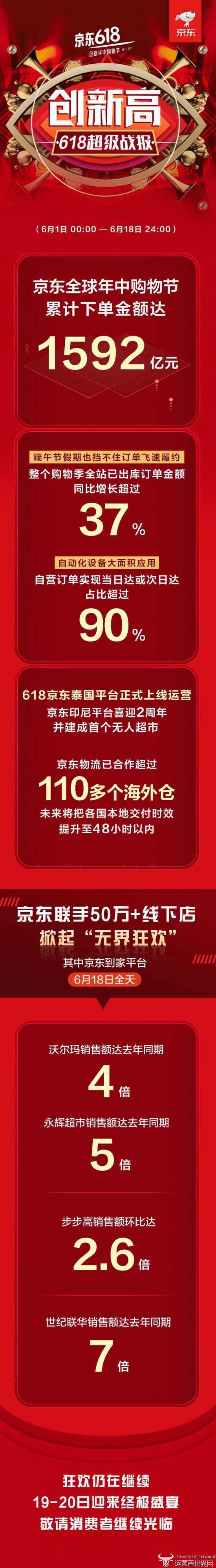 京东全球年中购物节在6月18日迎来最高潮,从2018年6月1日0点到6月18日24点,累计下单金额达1592亿元,其中出库订单金额同比增长超过37%。随着京东物流自动化设备大面积应用,618期间,90%以上自营订单实现当日达或次日达。