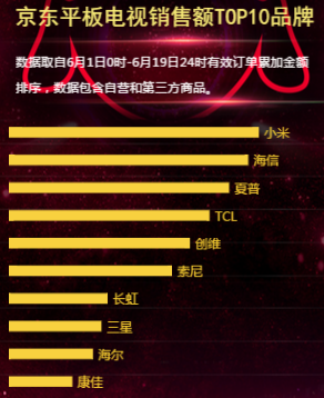 从6月1日0时-6月19日24时有效订单累加金额来看,在京东平板电视销售额TOP10品牌中,小米、海信、夏普分列前三名,紧接着是TCL、创维与索尼等,而三星电视销售额则排名倒数第三,仅次于长虹电视。