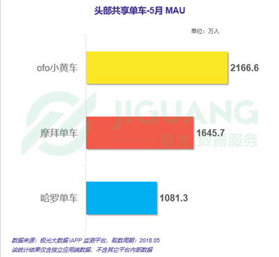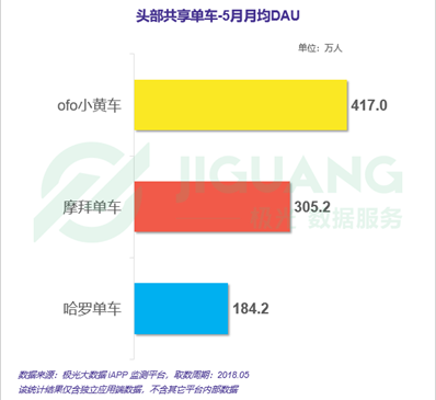 另外极光5月数据还显示,ofo的日均活跃用户数为417万人,摩拜单车日均活跃用户数为305.2万人,哈罗单车活跃用户数为184.2万人。
