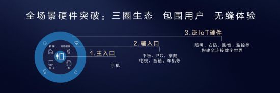 由此,华为提出的全场景生态战略正是基于上述两个层面进行了构想。硬件层面,全场景生态战略以手机作为主入口,平板、PC、穿戴、电视、音箱、车机等作为辅入口,照明、安防、影音、监控等作为泛IoT硬件,构建全连接数字世界,形成三圈生态包围用户,给用户提供无缝的极致体验。