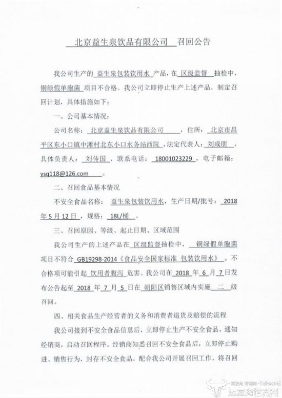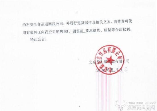 公告还提到,目前北京益生泉目前已停止生产不安全食品,并通知了经销商启动召回程序,消费者可使用有效凭证到北京益生泉销售部要求退货、赔偿等。