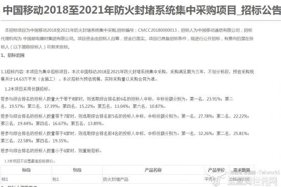 日前,中国移动发布了一则公告称,将对未来三年的防火封堵系统进行集中采购,而防火封堵对于通信安全防范有着重大的作用,如此大面积的采购,可见中国移动对通信安全防范的重视程度。
