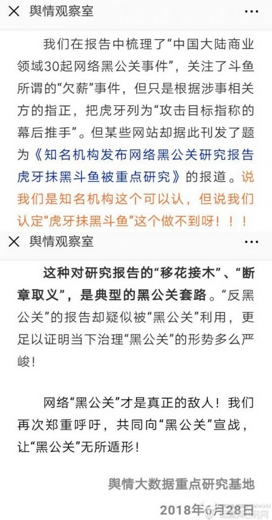 据悉,该报告梳理了“中国大陆商业领域30起网络黑公关事件”,而在其中,斗鱼与虎牙的“黑公关”案例尤为惹眼,毕竟前几天这件事才刚刚闹上热搜。运营商世界网就此事独家采访了斗鱼与虎牙两方,双方均对此做出了相应的回复。