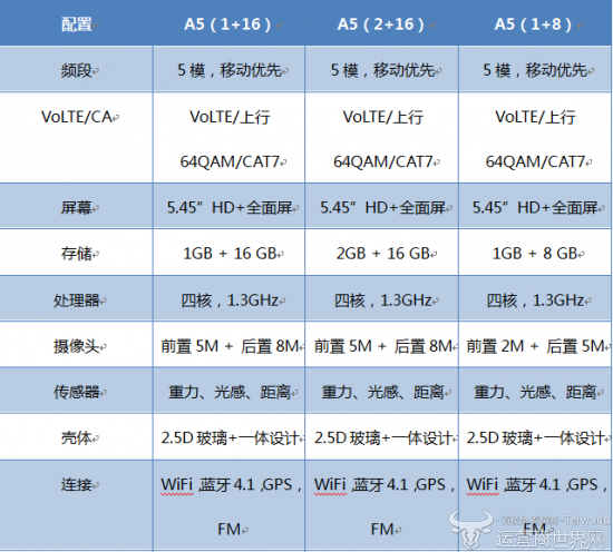 从配置中我们可以看到,该机采用5.45”HD+全面屏,支持64QAM/CAT7 5模(移动优先),配备1GB+8GB、1GB +16GB、2GB+16GB等三种存储组合可供选择,配备2M+5M、5M+8M两种摄像头组合,成像能力不错。支持64QAM/CAT7,网速至少提升50%,百元机也能体验极速上网。